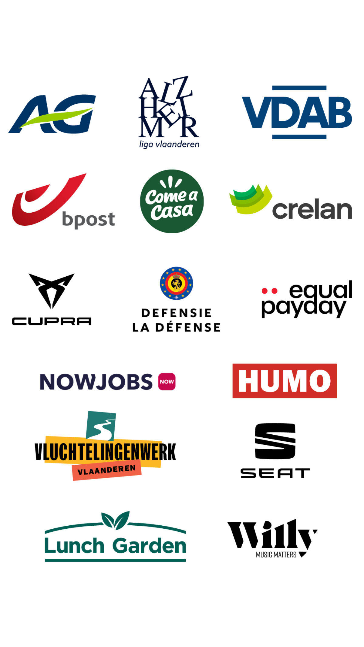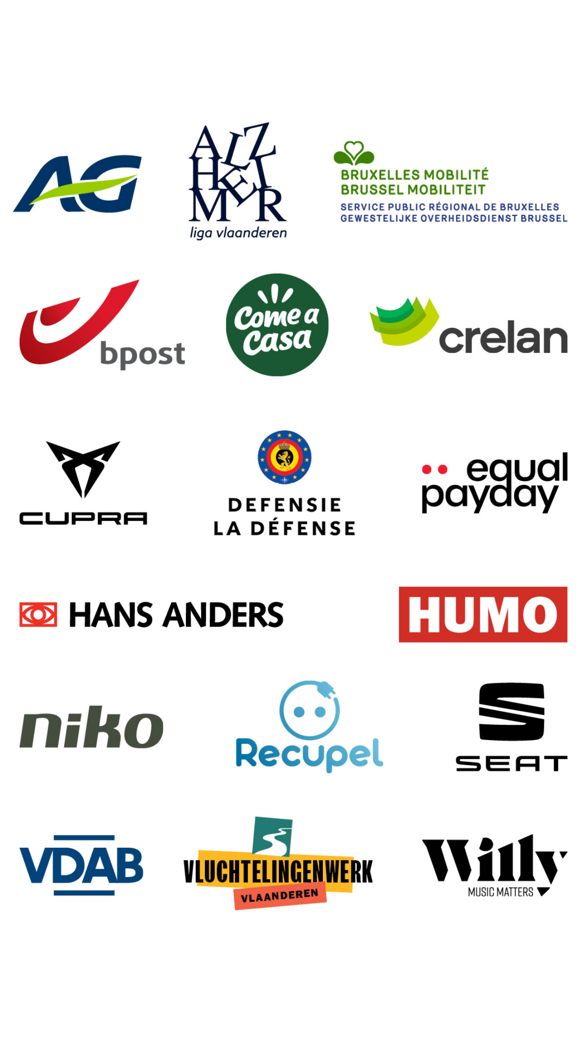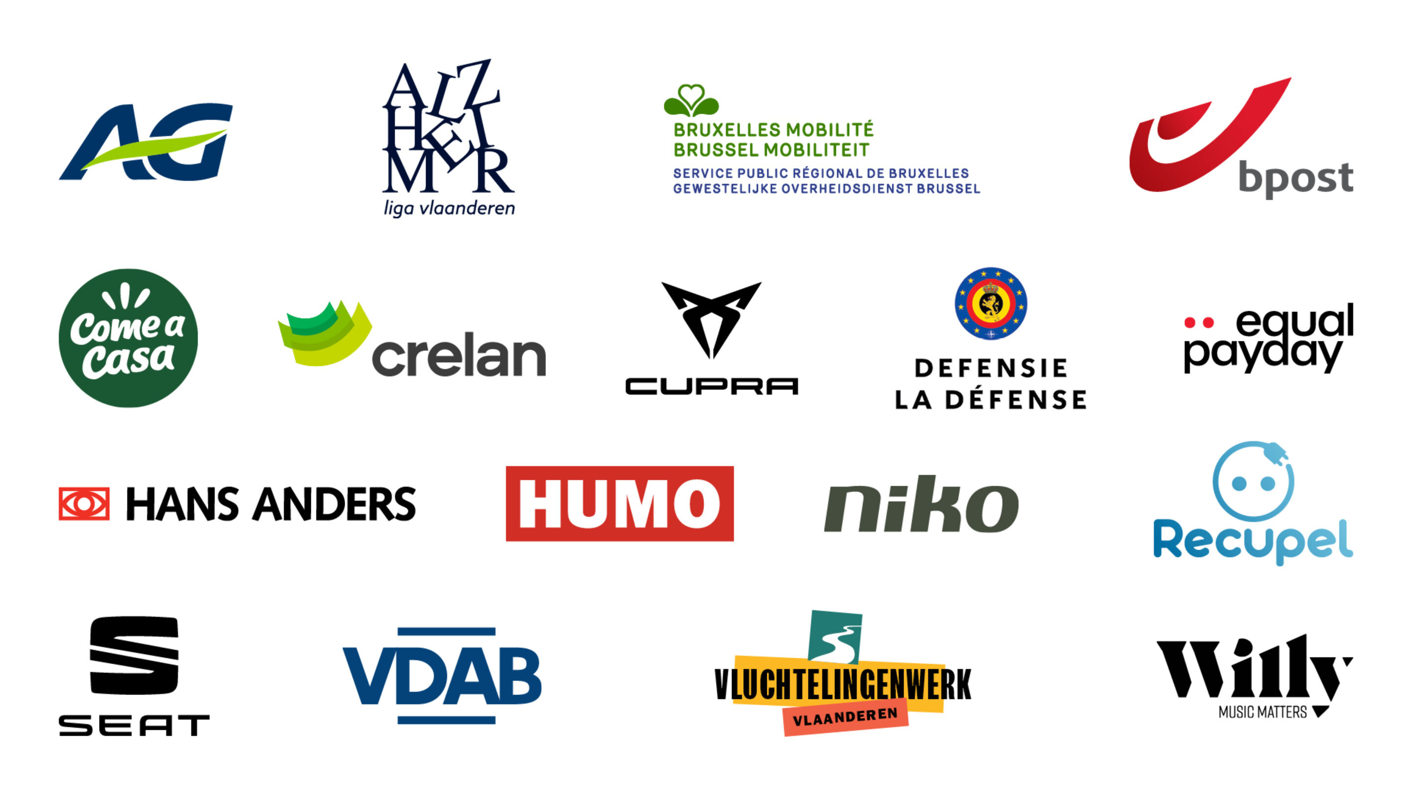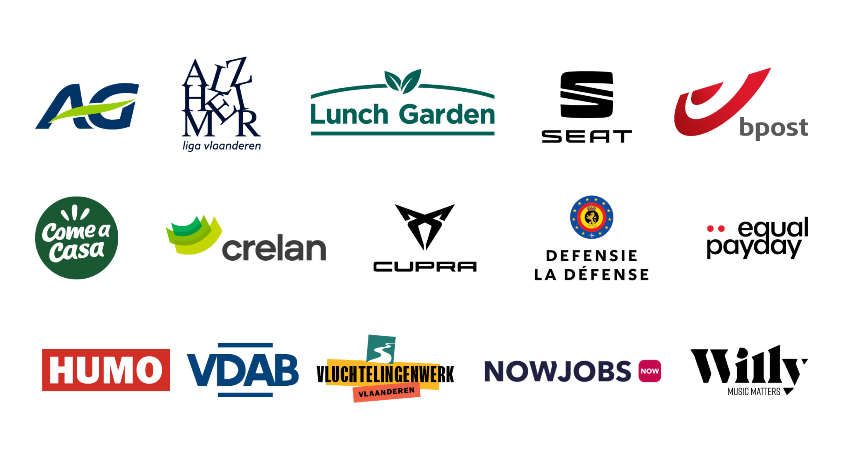 We are lead agency for Crelan, bpost, Recupel, VDAB, Niko, Come a casa, Cupra & Seat, Hans Anders, Belgian Defence, Brussel Mobiliteit, Humo, Willy, Equal Pay Day (ZIJkant), AG Insurance, Vluchtelingenwerk Vlaanderen and Alzheimer Liga Vlaanderen.